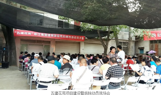 為進(jìn)一步推進(jìn)浐河?xùn)|岸“五建花苑”職工住房項(xiàng)目建設(shè),保障拆除安置工作平穩(wěn)有序高效進(jìn)行。2017年7月14日,職工服務(wù)中心在原五公司木材廠(28畝地)召開了五建花苑項(xiàng)目建設(shè)暨拆除動(dòng)員現(xiàn)場(chǎng)會(huì)?,F(xiàn)場(chǎng)會(huì)邀請(qǐng)了90余戶住戶及西建五公司領(lǐng)導(dǎo)出席參加。