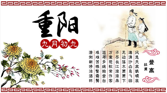重陽節(jié)是中華民族的傳統(tǒng)節(jié)日,《易經(jīng)》中把“六”定為陰數(shù),把“九”定為陽數(shù),九月九日,日月并陽,兩九相重,故曰重陽,也叫重九。慶祝重陽節(jié)一般包括出游賞秋、登高遠(yuǎn)眺、觀賞菊花、遍插茱萸、吃重陽糕、飲菊花酒等活動。1989年農(nóng)歷九月九日被定為老人節(jié),倡導(dǎo)全社會樹立尊老、敬老、愛老、助老的風(fēng)氣。