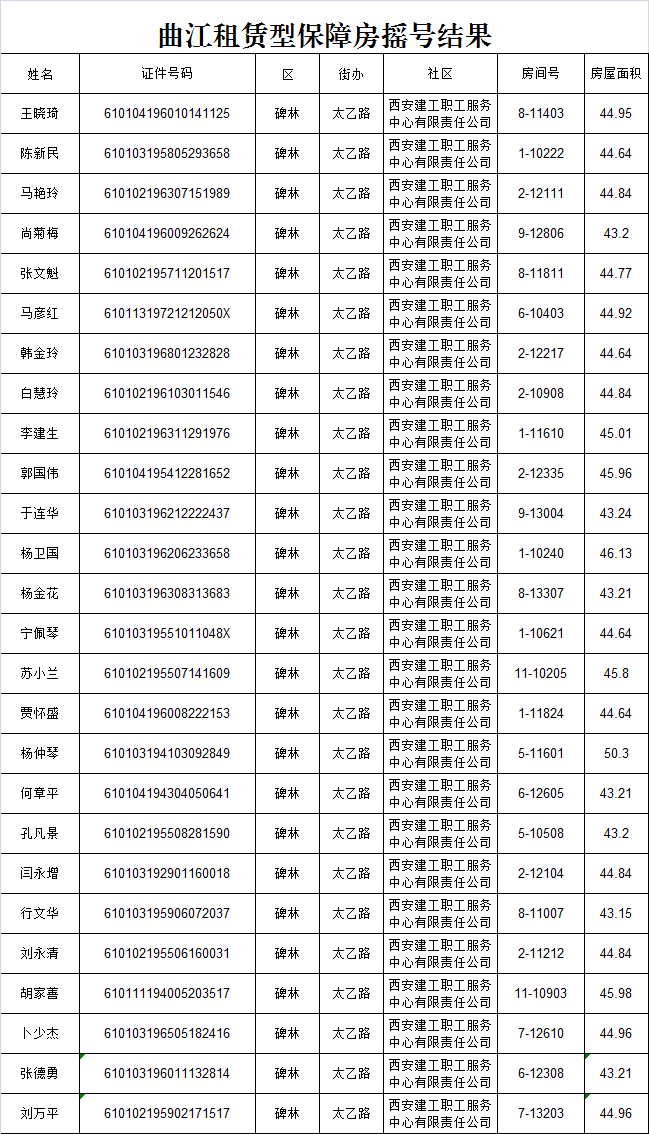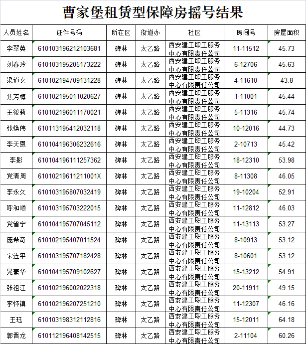 經職工服務中心與太乙路街辦的不斷配合和努力下,目前通過職工服務中心渠道申請曲江、曹家堡公租房的職工搖號結果已經下達,現(xiàn)將搖號結果公示如下。后續(xù)看房、簽訂租賃合同等流程,目前日期暫未確定,請職工繼續(xù)關注職工服務中心微信公眾號,我們得到消息后會第一時間為您進行通知。