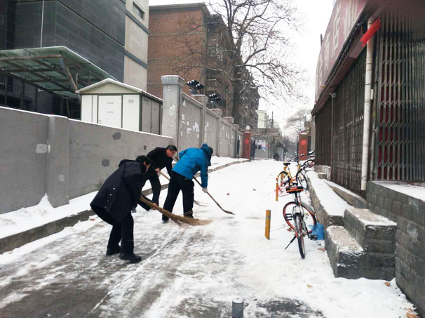 東城桃園小區(qū)物業(yè)工作人員認(rèn)真清理道路積雪。