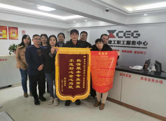 12月10日下午,職工服務中心托管職工宮慶順高興的將一面印有“熱情服務、專業(yè)高效,不忘初心、全心為民”的錦旗和感謝信送到了中心人事托管服務大廳,連連向大廳的工作人員表示感謝:“感謝你們能全心全意為職工著想,這次徹底解決了困擾我多年的工齡認定問題,服務中心真是我們托管職工的貼心人!這面錦旗你們受之無愧!”