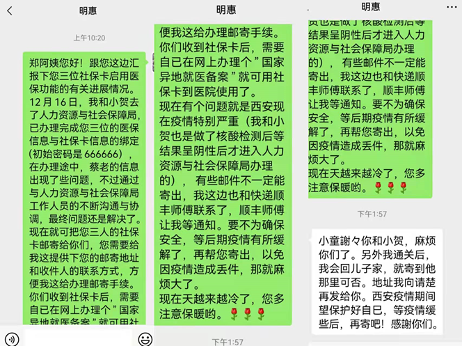 在老人單位的配合下,雙方一同前往市醫(yī)保經(jīng)辦中心修改職工醫(yī)保基本信息,并獲取綁定信息所需材料。過(guò)程中又發(fā)現(xiàn)老人未及時(shí)反饋?zhàn)C件信息更新的情況,此外還遇到個(gè)人養(yǎng)老認(rèn)證綁定信息的確定、市人社系統(tǒng)內(nèi)無(wú)法查詢其中1位老人信息、疫情形式嚴(yán)峻等問(wèn)題。工作人員克服重重困難,最終將鄭明慧老人及其他2位老人的社保卡與醫(yī)保信息成功綁定。至此,耗時(shí)近10個(gè)月,平臺(tái)事業(yè)部成功協(xié)助3位居住在香港的退休職工領(lǐng)取到社??ǎ⒙毠めt(yī)保信息綁定到其社??ā?/span>