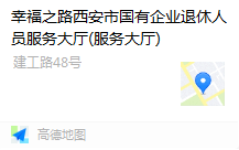 導(dǎo)航:可通過(guò)高德地圖、百度地圖搜索“幸福之路西安市國(guó)有企業(yè)退休人員服務(wù)大廳”,具體位置信息截屏如下:
