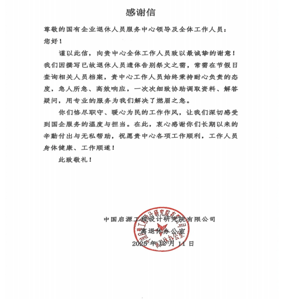 不僅如此,中國啟源工程設(shè)計(jì)研究院有限公司離退休辦公室也特意發(fā)來感謝信。因撰寫已故退休人員遺體告別祭文,常需在節(jié)假日緊急查詢檔案,西安市國有企業(yè)退休人員服務(wù)中心工作人員始終秉持耐心負(fù)責(zé)的態(tài)度,急人所急、高效響應(yīng),一次次細(xì)致協(xié)助調(diào)取資料、解答疑問,用專業(yè)服務(wù)解決了燃眉之急,讓企業(yè)深切感受到國企服務(wù)的溫度與擔(dān)當(dāng)。